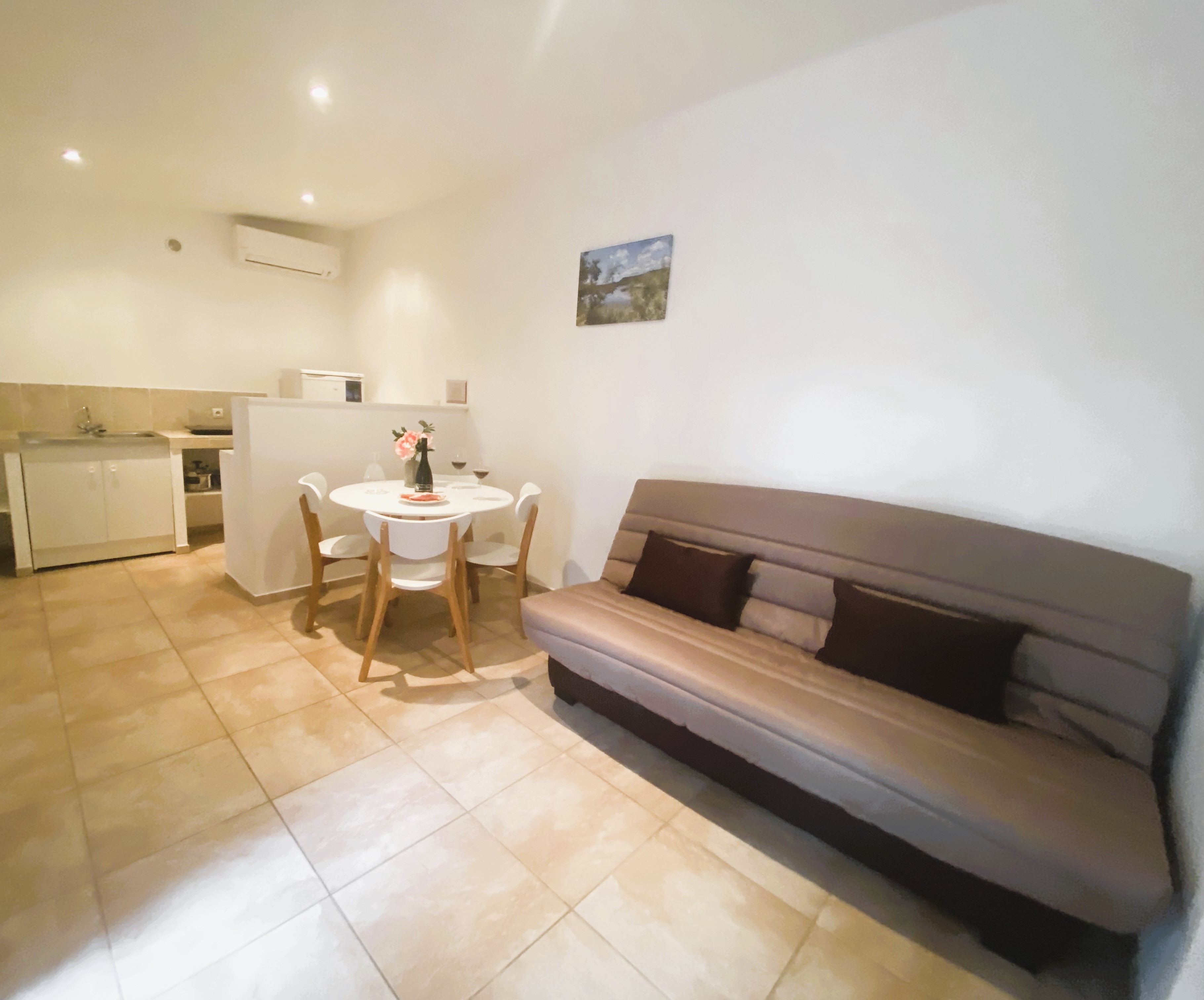 | CARACTERISTIQUES Max: 4 personnes Surface: 35 m² environ 1 cuisine équipée 1 mini séjour intérieur avec canapé convertible 1 chambre 1 lit double (140) 1 salle d’eau avec WC Terrasse extérieure en bois | EQUIPEMENTS INVENTAIRE : Cliquez ici pour consulter l’inventaire. LOCALISATION Zones D et E, dans la pinède, entre 6 et 8 minutes à pied de la plage Location de linge sur demande. |