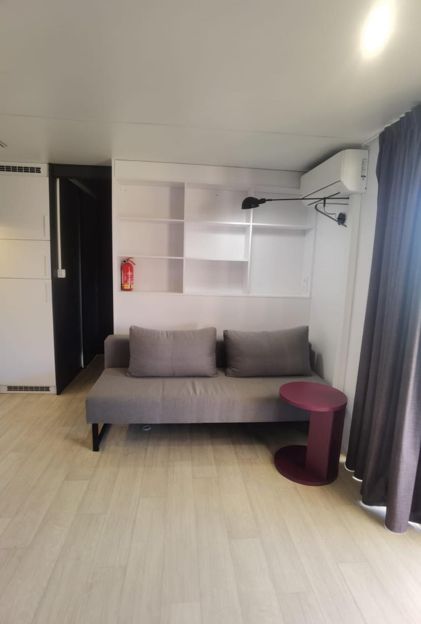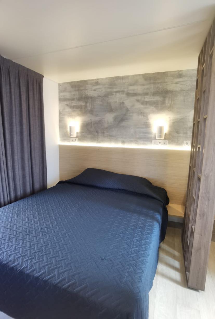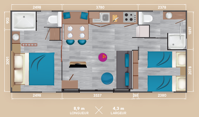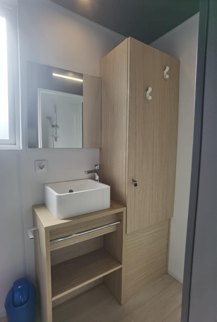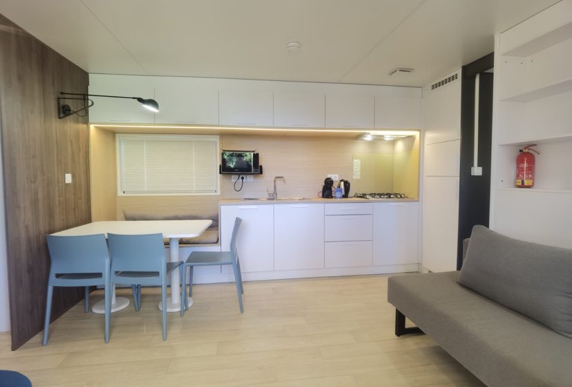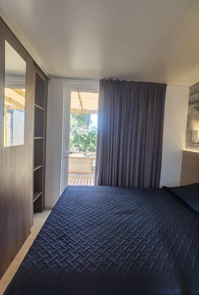 | CARACTERISTIQUES Max: 4 ou 6 personnes selon modèle Surface: 35 m², 40 m² pour le modèle 6 personnes 1 cuisine équipée 1 terrasse 1 séjour intérieur 1 chambre 1 lit double (160) 1 chambre 2 lits simples (90) 1 chambre 2 lits superposés (90) pour le modèle 6 personnes 2 salles d’eau avec WC | EQUIPEMENTS Climatisation Lave-vaisselle Mise à disposition de vélos électriques pour adultes Location de linge sur demande. INVENTAIRE Cliquez ici pour consulter l’inventaire. LOCALISATION Zone B, à environ 15 minutes à pied de la plage |